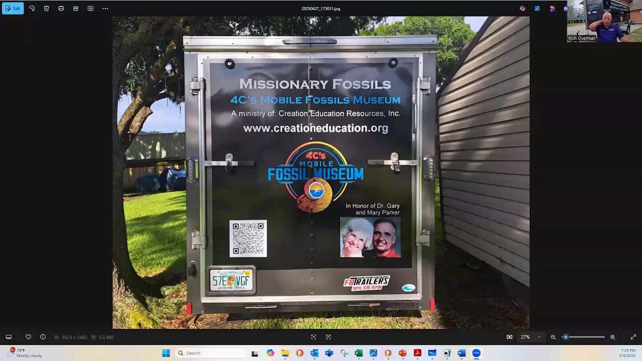 Description: Rich Overman has a mobile creation museum called the 4 C’s. They stand for Creation, Corruption, Catastrophe and Christ. Gary and Mary Parker had the Creation Adventure Museum in Arcadia, Florida, and they operated if for many years. However, Mary Parker became ill and subsequently passed away, and they decided to close the museum. Rich Overman and his wife Ginger decided to take the artifacts and displays from that museum and turn it into a traveling museum.